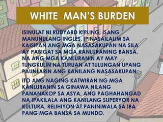 Iba pang Salik sa Paghahangad ng mga Kanluranin ng Kolonya Industriyalisasyon Pamumuhunan White Mans Burden Rudyard Kipling.