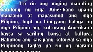 5Tumatalakay sa pagkamakabayan o kayay mga paksang romantisista. Hindi lang umunlad ang edukasyon pero pati na rin ang totoong kahulugan ng demokrasya. 1242012 Ang pananakop ng mga Amerikano ay isang pagbabalat-kayo na sa umpisa ay nagkukunwaring mga tagapagligtas ng kalayaan ng Pilipinas ngunit sa bandang huli ay unti-unting nagtanggal ng maskara.