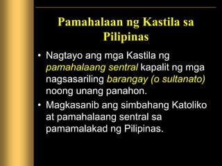 PANAHON NG KASTILA SA PILIPINAS Ang pananakop ng mga kastila sa Pilipinas ay isa na marahil sa pinaka mahalagang parte ng ating kasaysayan. Ito ay ang lugar na kung saan ang naging unang pamayanang Kastila at syudad sa Pilipinas. Tuwirang sinakop at pinamahalaan ng dayuhang mananakop ang isang bansa.