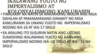 Lahat ng tao ay nakinabang sa kaunlaran na ginawa ng mga kanluranin. MGA DAHILAN IKALAWANG YUGTO NG IMPERYALISMO AT KOLONYALISMO SA TIMOG AT KANLURANG ASYA ika-18 hanggang ika-19 siglo ang. Nanguna sa pagtatayo ng mga kolonya ang.