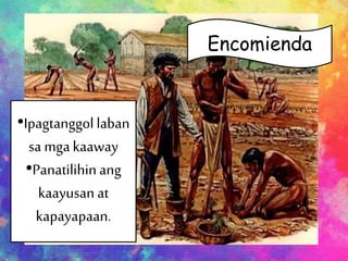ENCOMIENDA TRIBUTO AT POLO Y SERVICIOS Ang ilan pang paraan o sistema ng pananakop na ginamit ng mga Espanyol sa Pilipinas ay ang sistemang. Ang layunin ng mga espanyol sa pagsakop sa pilipinas ay. Polo y servicios Narito ang mga paraan na ginamit ng mga Espanyol para masakop ang Pilipinas.